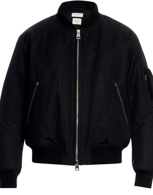 The Bottega Veneta brand bomber jacket has original inserts on the forearms. It is finished with ribbed edges at the collar, cuffs and waist.