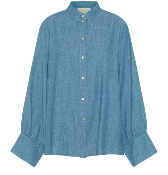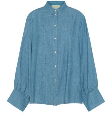 Boxy shirt with collar in stonewashed chambray. Catinga features full, long sleeves gathered into a deep cuff.