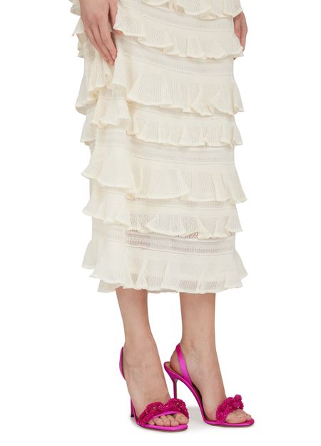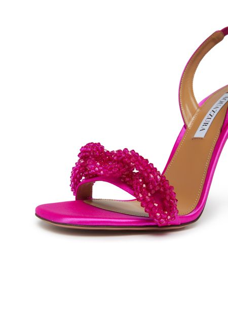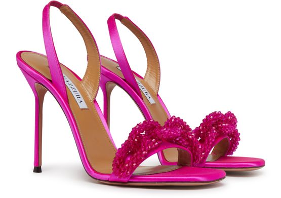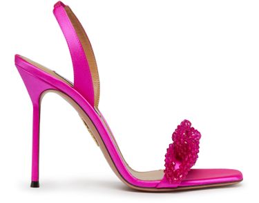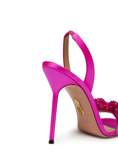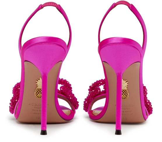 Aquazzura's Chain Of Love Sandals 105 feature a very thin sole and a stiletto heel for a sleek and elegant look. The logo-printed insole adds a touch of luxury, while the studded strap and ankle strap add a modern edge to the design. Perfect for making a statement at any special occasion.