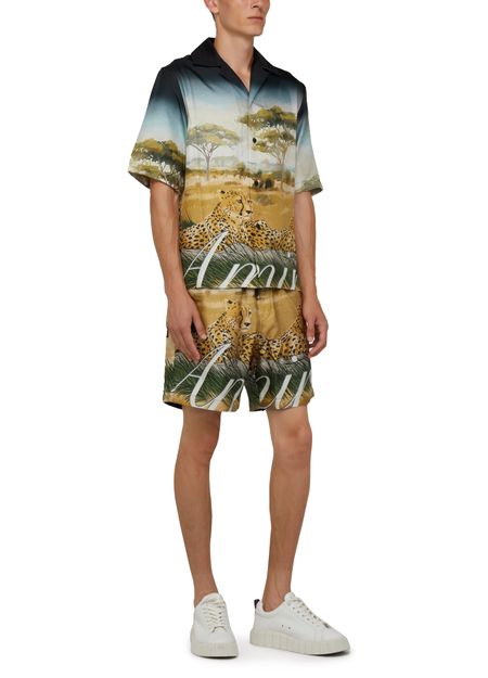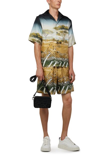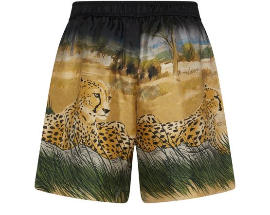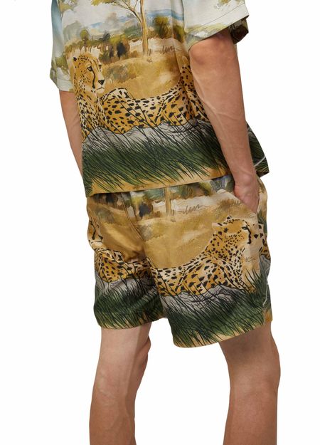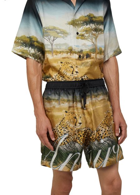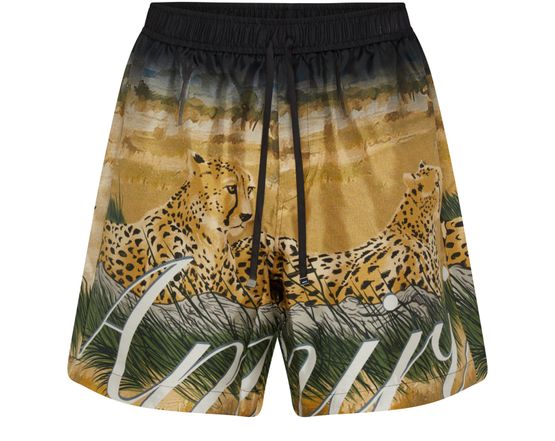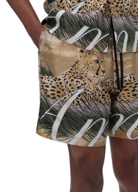 Amiri's Cheetah print drawstring shorts feature a bold cheetah pattern throughout. The shorts have a logo at the back label and printed logo on the front. They offer a comfortable fit with an elasticated drawstring waist. Perfect for adding a statement touch to your casual summer wardrobe.