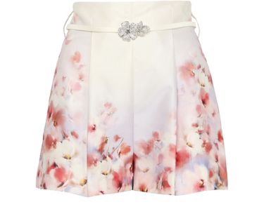 Zimmermann's Crush flat front short showcases a stylish short length with a charming floral print. Featuring a concealed back zipper closure and belt loops, it offers versatility for any occasion. The visible stitching adds a touch of detail, while back and welt pockets enhance functionality, creating a chic belted waist look.