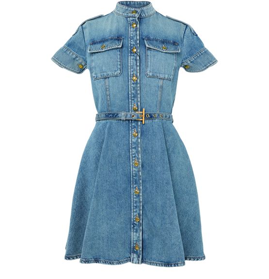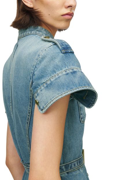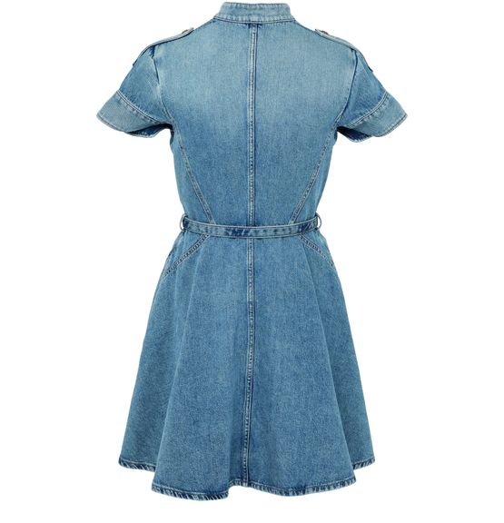 Reveal Alexander McQueen's denim mini dress, crafted from faded denim with a mandarin collar and short, cuffed sleeves. The knee-length silhouette features contrast stitching, button fastening, and two breast patch pockets, making it a versatile shirt dress that transitions effortlessly from day to evening.