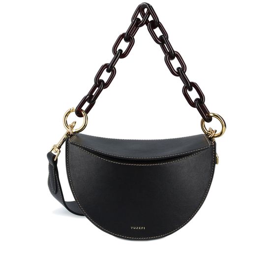 Worn on the shoulder, the Doris bag with contrasting seams, created by Yuzefi, seduces with its half-moon shape, its horizontal folded-down flap and its wide chain.