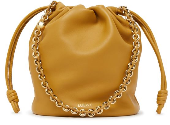 Loewe's Flamenco Purse Bucket bag is a chic hand-carried accessory made of mellow nappa lambskin. It features a front logo, drawstring closure, and a small bucket bag design for a trendy and versatile look.