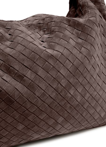 Reveal Bottega Veneta's Hop small bag, crafted in sumptuous suede with the iconic Intrecciato weaving technique. The padded texture and visible stitching showcase refined artistry, while a single handle and zippered interior pocket offer both style and practicality for the modern wardrobe.