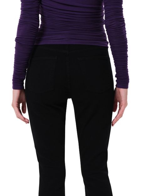 • Description : Bootcut, denim, high-waisted fit, two front pockets, back pocket, visible stitching, buttoned zipper closure, belt loops.