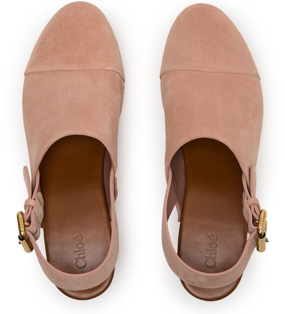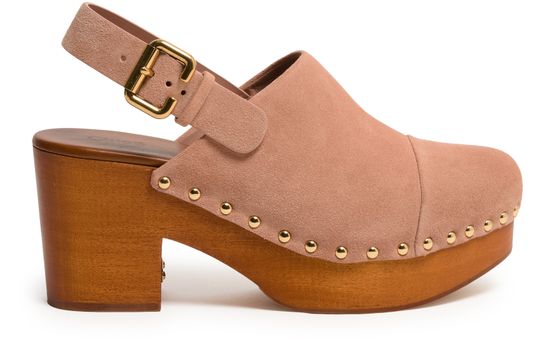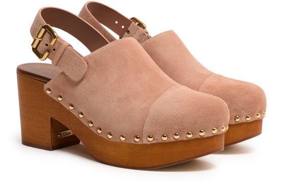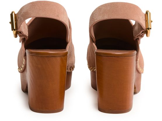 Reveal Chloe's Jeannette clogs, crafted from supple suede with a medium platform heel and round closed toe. The buckled strap and visible stitching add a modern edge, while gold-finish studded details and an engraved logo elevate the wooden sole for a statement look.
