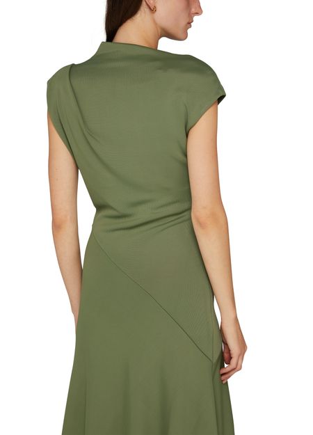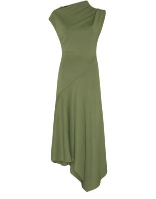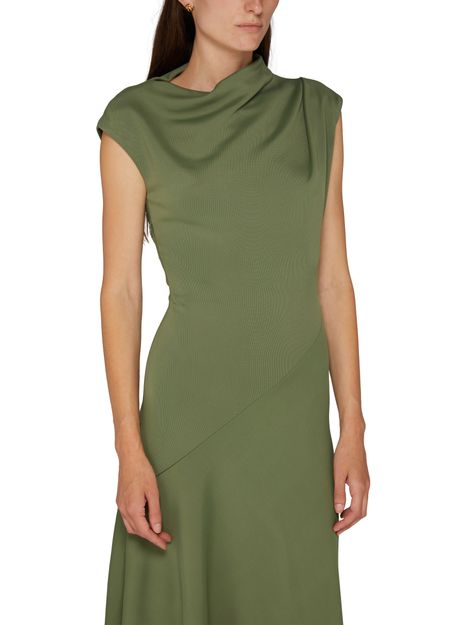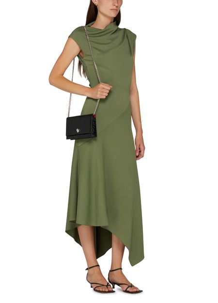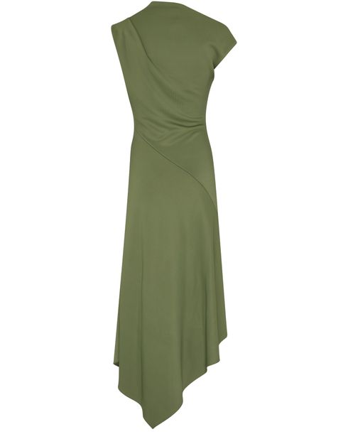 McQueen's Jersey dress showcases a sleeveless design with an asymmetric neckline, perfect for cocktail and evening events. Its maxi length and asymmetric cut create a striking silhouette, while the side zipper closure ensures a seamless fit. A subtle logo at the back label adds a touch of refined elegance.