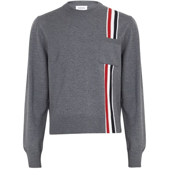 Thom Browne dresses men with pure, straightforward elegance, as shown in this merino wool tricolor band sweater, pleasant both to wear and to look at.