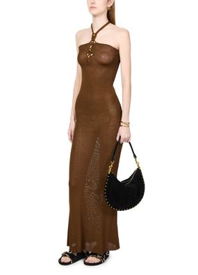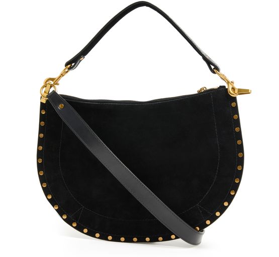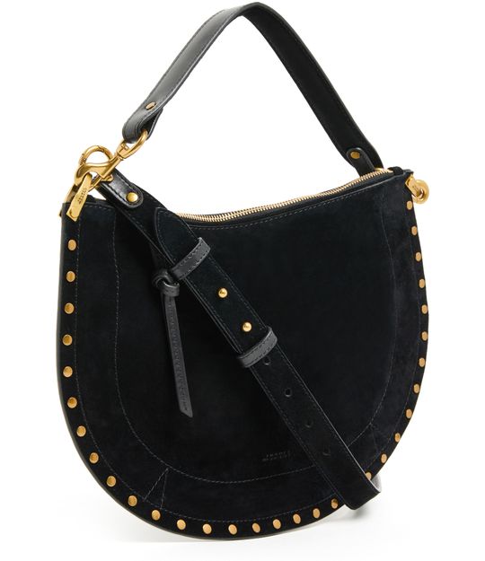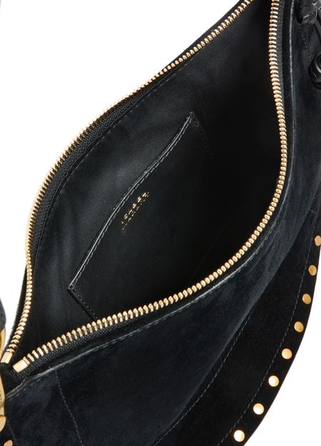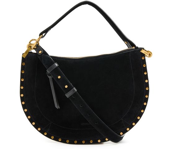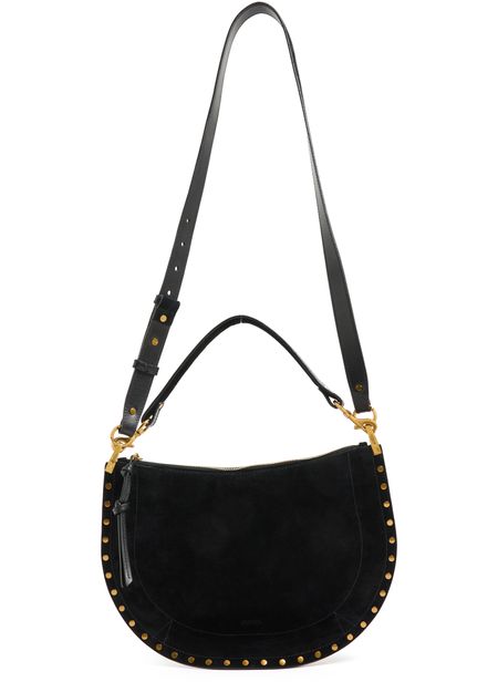 Unveil Isabel Marant's Oskan soft zipped bag, a masterpiece of suede craftsmanship. This hobo bag features a single handle and a thin, adjustable, detachable strap for versatile wear. Adorned with studded details and a zipper closure, it offers a single compartment with an interior pocket, all finished with gold-tone metallic details.