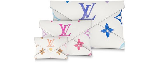 For the seasonal Resort collection, the Kirigami Pochette comes in coated canvas printed with an oversized Monogram pattern. Each of the three envelopes features a different palette of summery shades and a coordinating leather lining with a pattern of Monogram Flowers. The largest pouch can hold a tablet, the medium one a passport, and the small one cards.