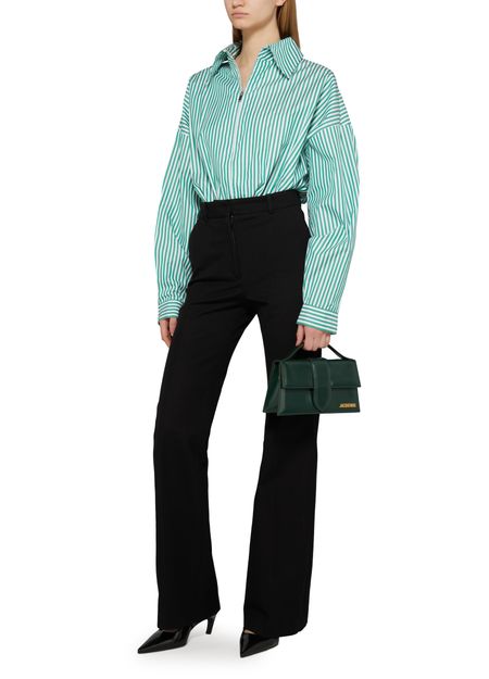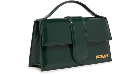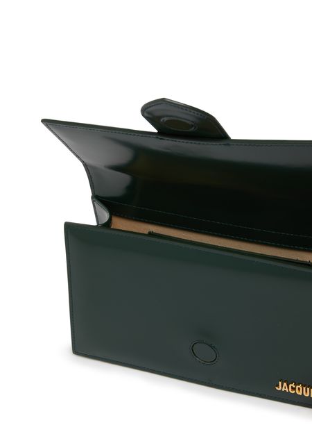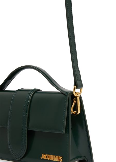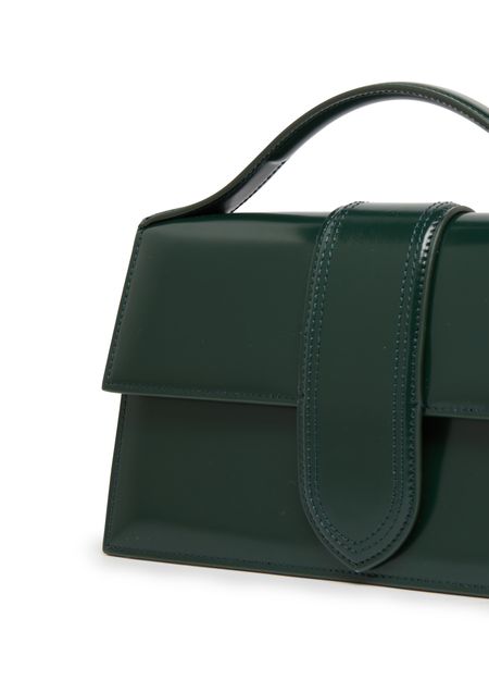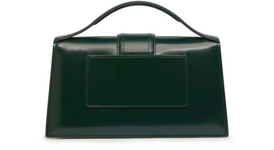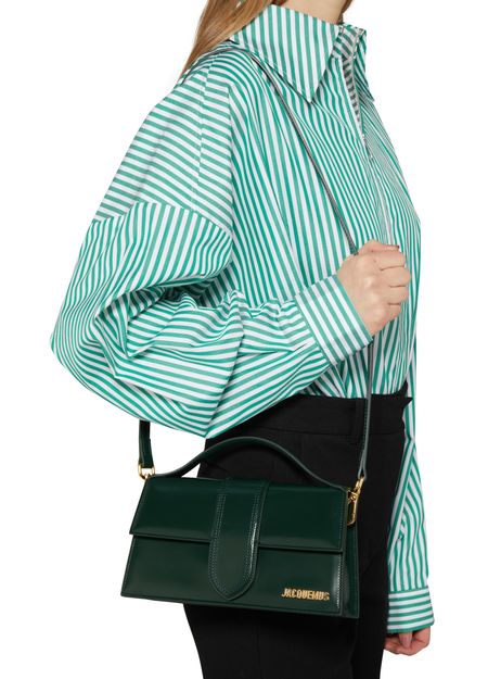 Le Grand Bambino is a versatile and stylish handbag made of smooth leather. It features a top handle, thin strap, and flap closure for easy access. The metallic logo on the front adds a touch of luxury. With visible stitching, it can be hand carried, worn on the shoulder, or crossbody for a chic look.