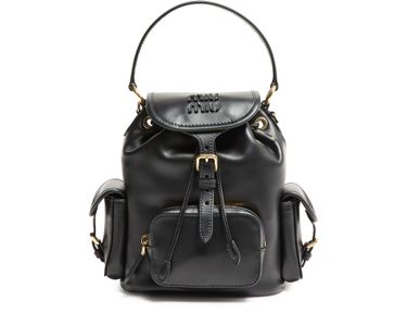 Unveil Miu Miu's leather backpack, a masterful blend of style and utility. Featuring smooth leather, a metallic 'miu miu' lettering, and adjustable, detachable straps, this shoulder bag offers versatility and elegance in every detail.