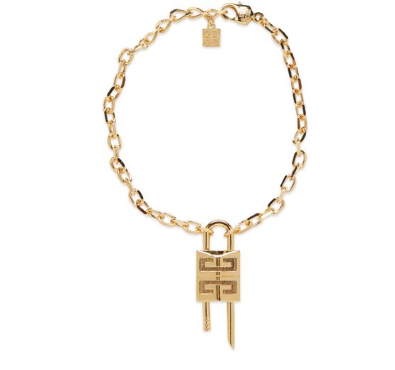 Givenchy'sLock Mini bracelet is a chic accessory featuring a luxurious gold finish. The bracelet showcases an engraved logo on the front for a touch of elegance. Perfect for adding a subtle statement to any outfit, this bracelet is a timeless piece that exudes sophistication and style.