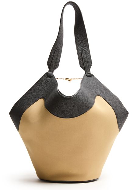 Description : visible topstitching, gold finish, printed logo, front logo, single compartment, shopper / tote bag, hand carried, worn on the shoulder, wide strap, single handle.