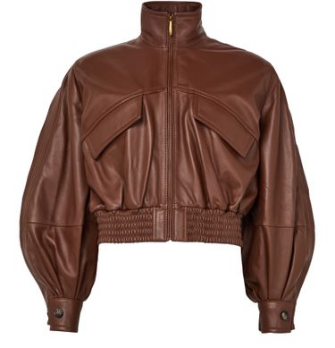 Reveal Zimmermann's Luna leather bomber jacket, crafted from smooth leather for a refined finish. The cropped silhouette, high neck, and long sleeves offer a modern edge, while flap and front pockets add practical flair. Topstitched edges complete this versatile piece, perfect for elevating any wardrobe.
