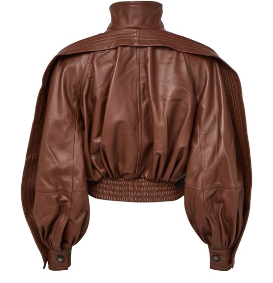• Description : Smooth leather, short, high neck, long-sleeved, flap pockets, two front pockets, zipper closure, topstitched edges.