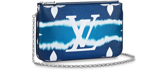 This special edition of the Pochette Double Zip is part of the Summer 2020 LV Escale collection of accessories and leather goods. It comes in Monogram Giant canvas with a tie|dye print in shades of blue inspired by the traditional Japanese Shibori technique. This versatile pouch features several pockets and a removable, silver|tone chain.