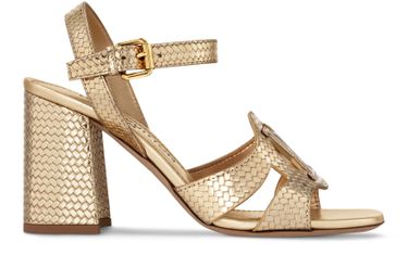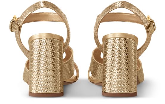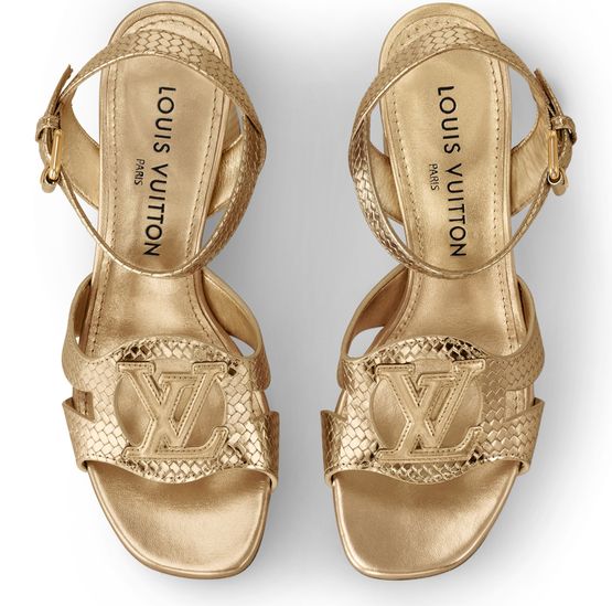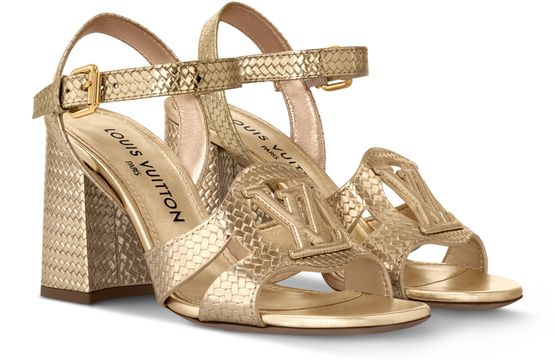 Metallic calf leather printed with a woven texture brings a glamorous touch to the LV Isola sandal. The front strap is embellished with a cut-out LV Circle signature, while the ankle strap is adjusted with a small, square buckle. This timeless style comes on a high block heel, which is also covered in woven-look leather.
