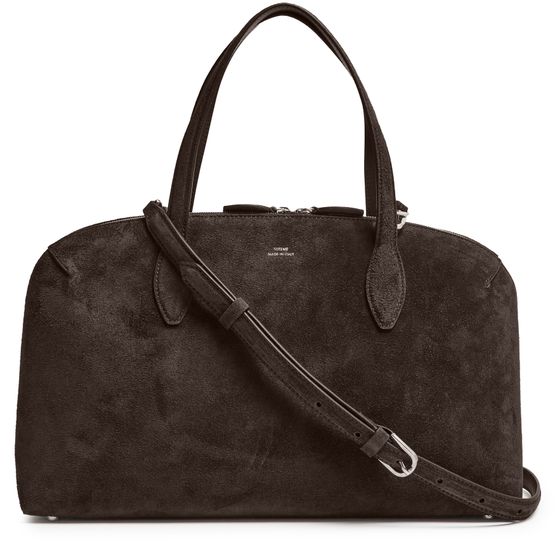 Reveal Toteme's M suede tote bag, crafted from supple suede with double handles and a thin strap for versatile carrying. The front logo and visible stitching highlight refined craftsmanship, while a spacious interior and secure zipper closure ensure both style and practicality for your everyday essentials.