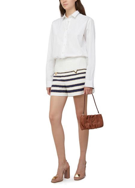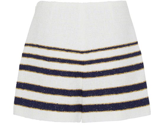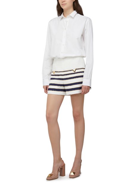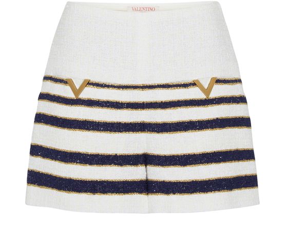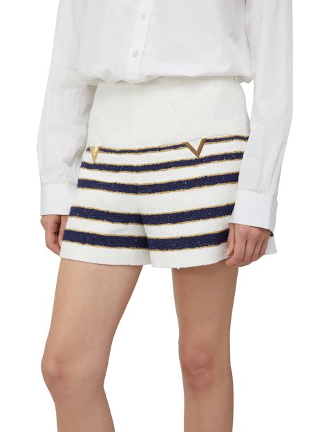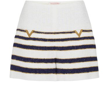 These cropped shorts by Valentino exude a timeless appeal with their high-waisted fit and straight cut. Crafted from the brand's signature Marinière tweed, they feature a striking striped print that adds a touch of sophistication. Finished with the brand's monogram detailing, these shorts are a perfect addition to elevate any wardrobe.
