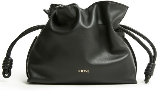 Loewe's Mini Flamenco clutch features a front logo in silver letters and a drawstring closure. It can be hand carried with its thin strap or worn on the shoulder or crossbody with the detachable strap. This versatile bag is perfect for adding a touch of elegance to any outfit.