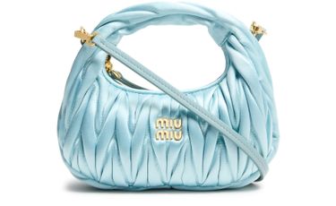 Introducing Miu Miu's mini bag, a masterpiece of modern elegance. Crafted from satin-finish leather, it features the iconic quilted herringbone detail and metallic logo. The detachable thin strap and single handle offer versatile styling, while the zipper closure ensures secure storage. Elevate your ensemble with this chic accessory.