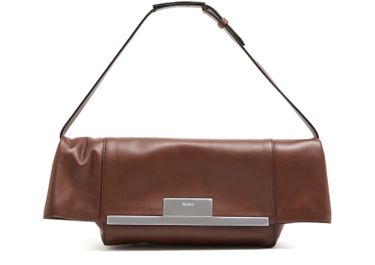 Description : hand carried, worn on the shoulder, adjustable strap, flap closure, magnetic closure, visible topstitching, engraved logo, front logo, mini bag, silver finish.