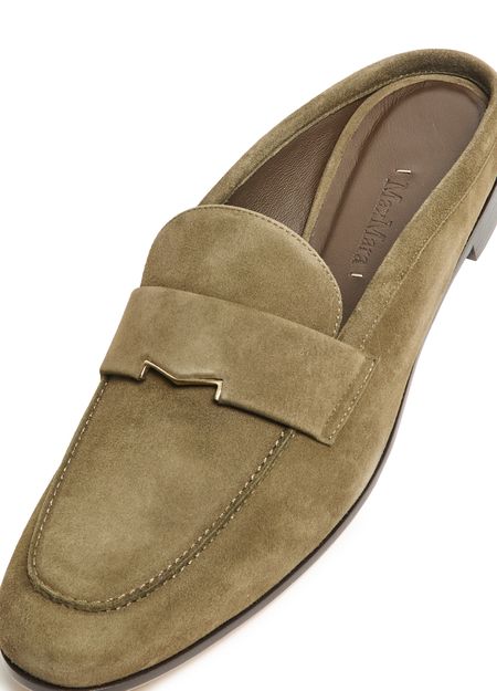 Reveal Max Mara's suede mules, crafted with a refined round closed toe and low heel for effortless sophistication. Visible stitching and an engraved logo add subtle distinction, while the leather interior ensures comfort. These mules blend modern elegance with everyday versatility, making them a standout addition to any collection.