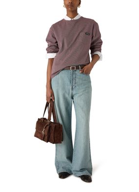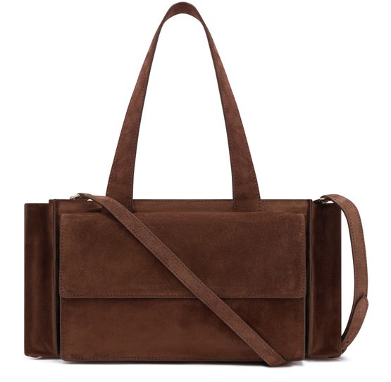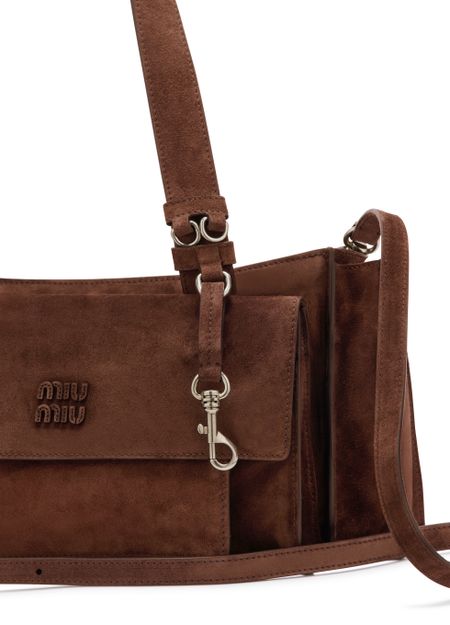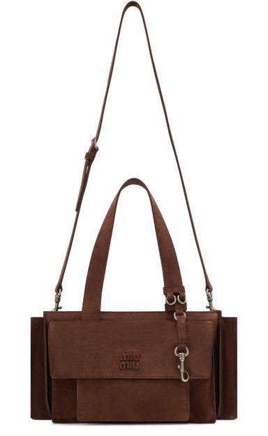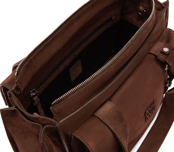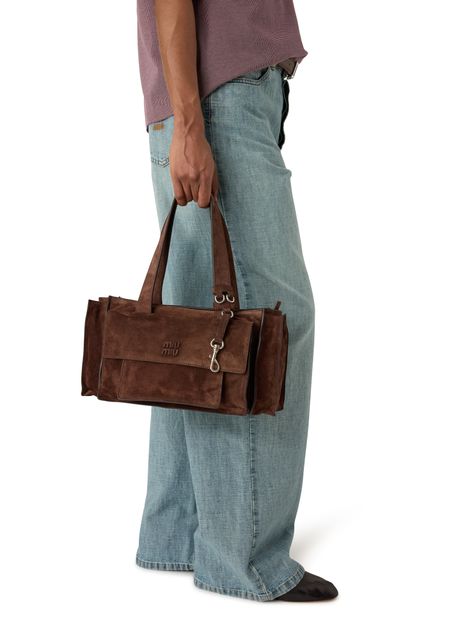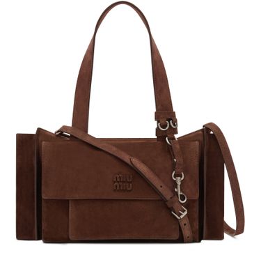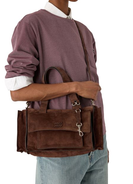 Reveal Miu Miu's multi-pocket hand-held bag, crafted in sumptuous suede with double handles and a thin, adjustable strap for versatile styling. The spacious interior features a zippered pocket and external compartments, while the front embossed logo and metal finish add a refined touch to this modern essential.
