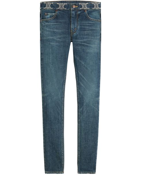 Celine Neo skinny jeans embody effortless sophistication. Crafted with a clean dark union wash, they feature Triomphe stud embroidery at the waist for a unique touch. The skinny fit hugs the waist and legs, complemented by a mid-rise waist and five pockets. Finished with rivets and an engraved zip, these jeans are a stylish staple made in Japan.