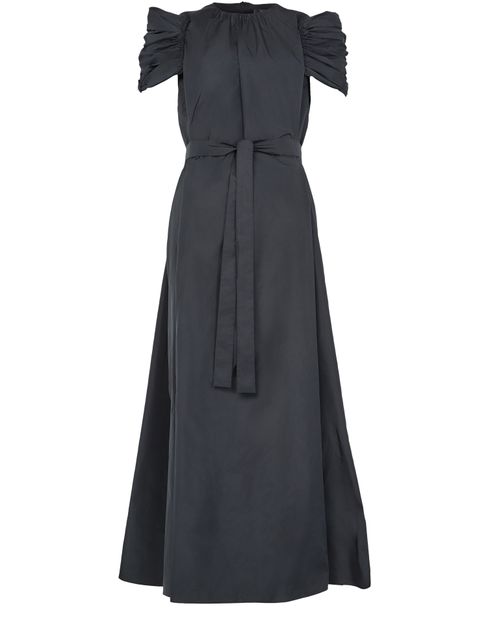 • Description : Loose fit, round neck, short-sleeved, ruffled sleeve, maxi dress, bow fastening, belt loops, belted waist.