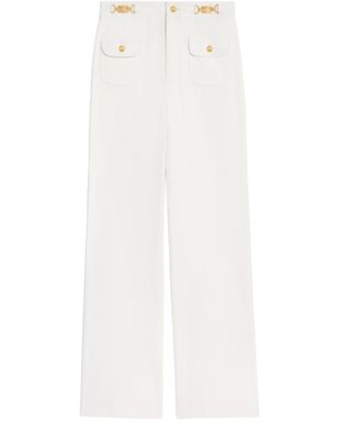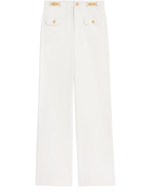Celine's Pants with gourmettes in cotton gabardine embody effortless elegance. The classic fit and high waist flatter every silhouette, while the Triomphe gourmettes add a touch of sophistication. With two patch pockets adorned with flap and Triomphe buttons, plus a refined zip and button closure, these pants are a must-have for discerning fashion lovers. Made in Italy, they promise quality and style.