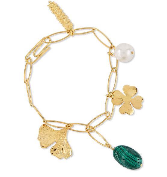 The Scarabée bracelet is designed by Aurélie Bidermann. It's embellished with a glass bead and malachite scarab, one of the Parisian designer's emblems.