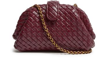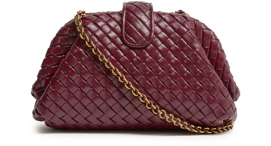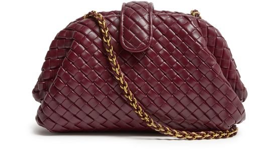 Reveal Bottega Veneta's intrecciato clutch, a statement piece crafted with the iconic weaving technique. The gold finish and padded texture add a refined touch, while the chain strap and magnetic closure ensure both style and practicality. Experience the elegance of a single-compartment leather interior.