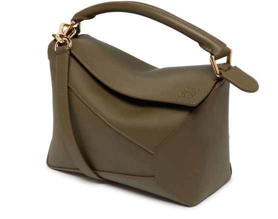 Loewe's Small Puzzle Edge bag features a flap closure and a zipper closure for added security. It showcases a front logo and embossed logo with gold finish details. This versatile bag can be hand carried, worn on the shoulder, or worn crossbody thanks to its detachable strap with a carabiner and thin strap design.