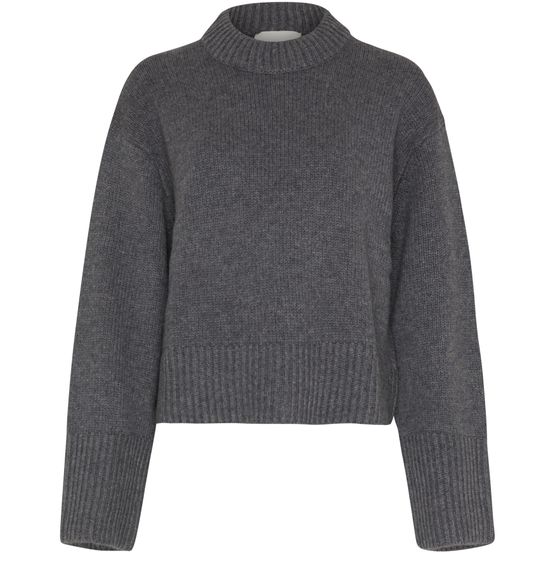 Reveal Lisa Yang's cashmere round-neck sweater, a cropped knitwear piece with a ribbed texture and dropped long sleeves. The round neckline and relaxed fit offer effortless sophistication, making it a versatile choice for layering or standalone styling across seasons.