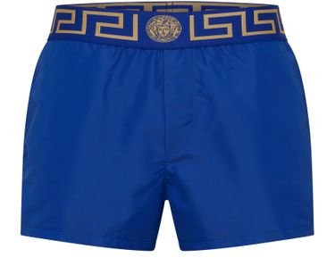 These swim trunks from Versace are loose and short. The Italian brand has added its signature motif to the elastic.