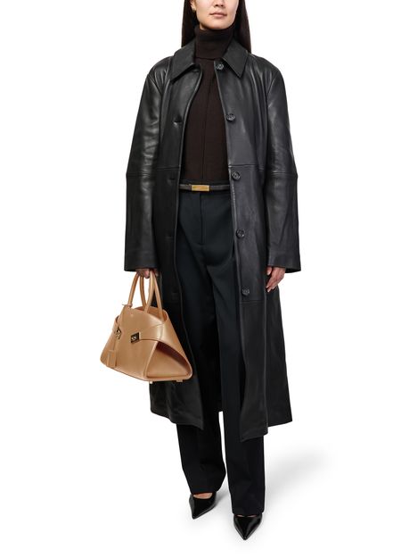 Reveal Toteme's T-Lock mini leather pouch, crafted from smooth leather. The visible stitching and metallic front logo highlight its modern appeal, while the twist lock and flap closure secure essentials in a single compartment with an interior pocket for effortless organization.