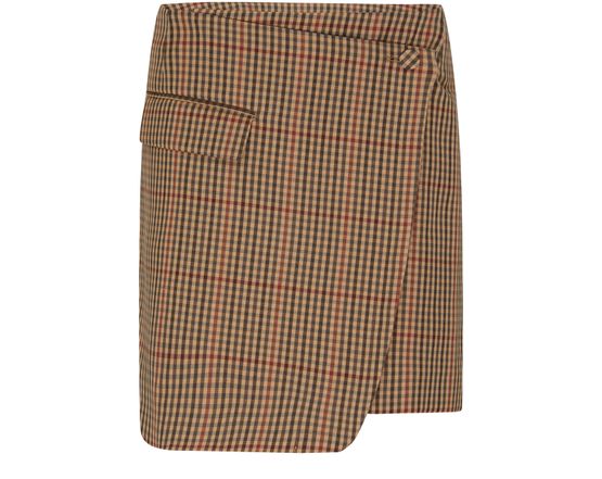 • Description : button fastening, knee length, flap pockets, asymmetric skirt, button covered in the same fabric, checked pattern, visible stitching.