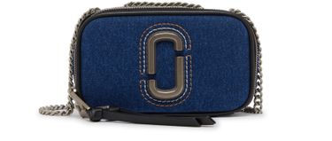 Marc Jacobs's The Snapshot Denim camera bag is a stylish mini bag with a zipper closure and a single handle. Its front logo and appliquéd logo add flair, while the embossed logo enhances its charm. With visible topstitching and an adjustable strap, it can be worn crossbody or with a chain strap for versatility.