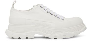 These Tread Slick sneakers by Alexander McQueen feature a thick, notched sole and a lace-up design for a modern look. A loop at the back makes them easy to slip on and off, while the embossed logo adds a touch of luxury. Perfect for adding a stylish edge to any casual outfit.