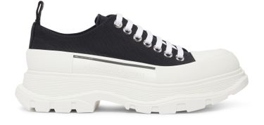 These Tread Slick sneakers by Alexander McQueen feature a thick, notched sole and a lace-up design for a modern look. A loop at the back makes them easy to slip on and off, while the embossed logo adds a touch of luxury. Perfect for adding a stylish edge to any casual outfit.