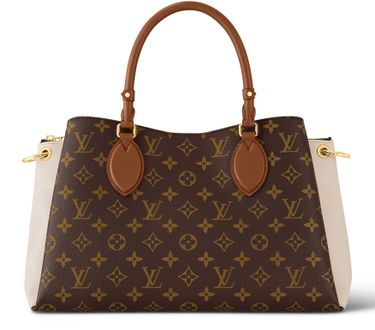 Evocative of the Louis Vuitton Pallas bag from 2012, with its combination of textures and colors, the Vendôme MM tote is fashioned from Monogram canvas with grained leather on the sides and smooth leather on the handles and handle mounts. Inside there are two compartments, room for a laptop, and numerous pockets.