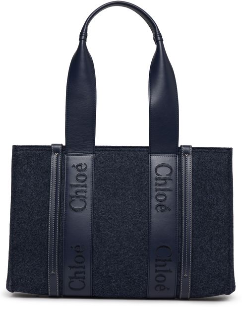 Chloe's Woody medium tote bag is a bi-material shopper with two leather handles. It features a jacquard logo and visible topstitching for a sleek, modern look. This versatile bag can be worn in the hand or on the shoulder, making it perfect for any occasion.