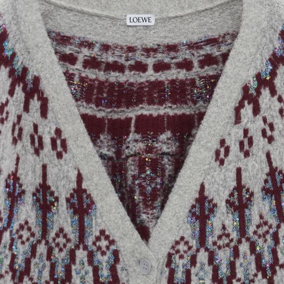 • Description : Relaxed fit, regular length, v-neck, button front fastening, welt pockets, ribbed cuffs and hem, lOEWE jacquard placed at the back.