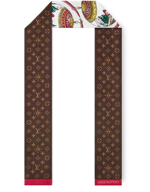 The Xmas Vivienne bandeau is a celebration of the holiday spirit in sumptuous, colorful silk. Against a backdrop of Christmas decorations adorned with Monogram motifs, the House’s adventure-loving mascot Vivienne is depicted enjoying three sports: sailing, ice skating and tennis, complete with an LV signature racket. A fun and festive accessory for the year-end season.