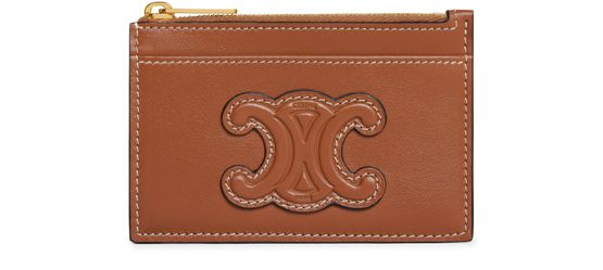 Celine's zipped cardholder in smooth lambskin leather is a sophisticated accessory that effortlessly combines elegance and practicality. With a sleek zipped closure, it features a spacious compartment and four credit card slots, making it perfect for the modern individual. This piece embodies luxury and style, elevating any ensemble.