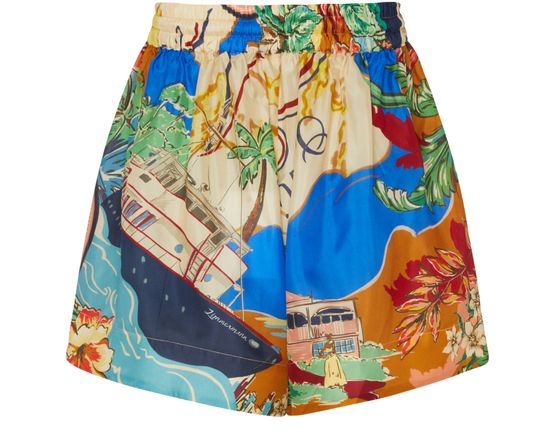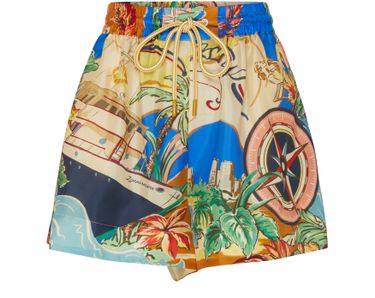 • Description : printed, short length, elasticated drawstring waist, side pockets.