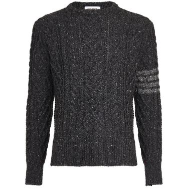 Textured braids, a large knit and the iconic band detail on the sleeve make Thom Browne's Aran Cable 4-Bar sweater a male wardrobe essential.